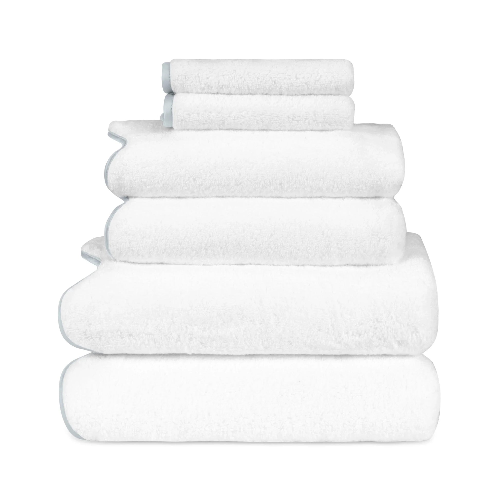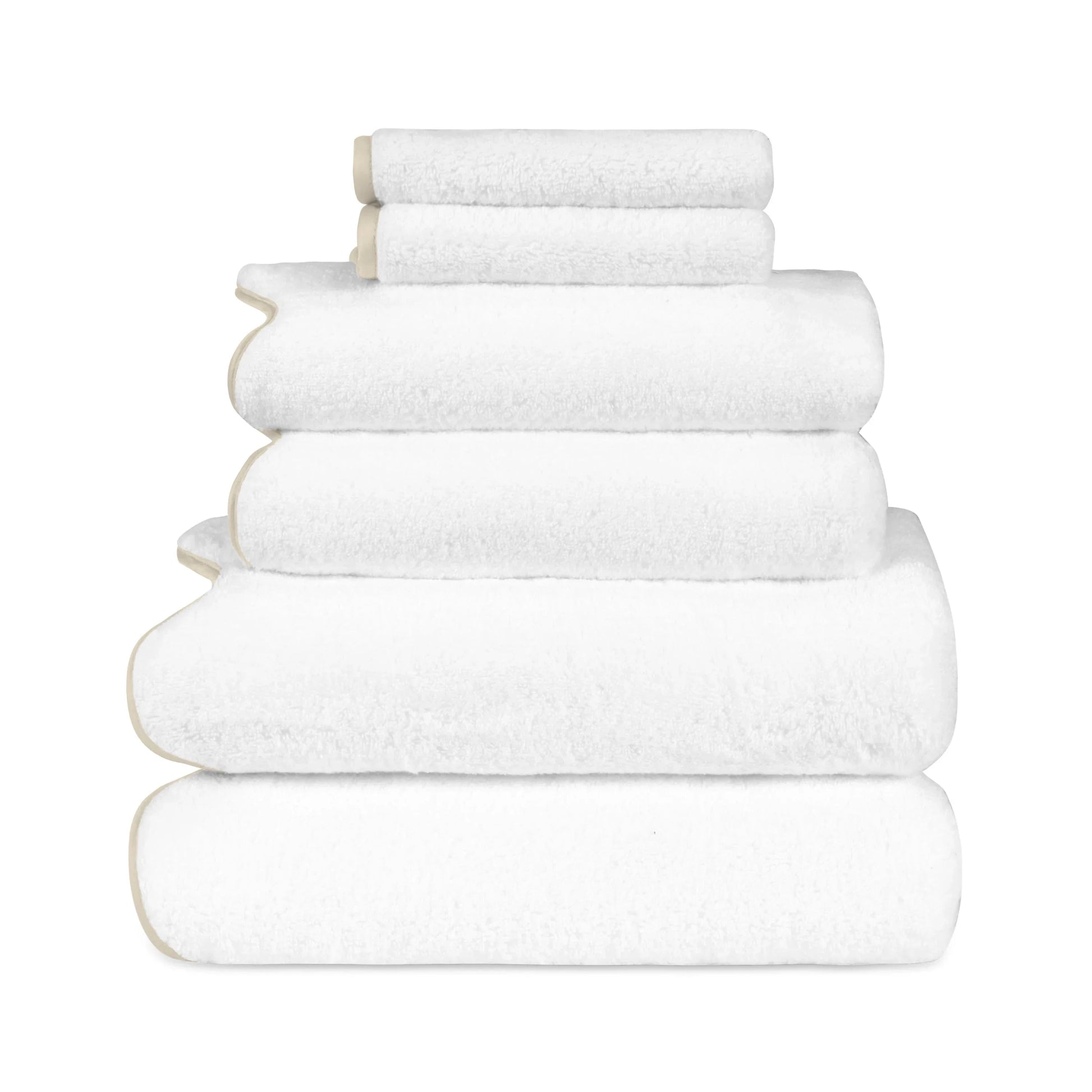 Nos serviettes de bain Antalya sont ornées d'un passepoil festonné pour une touche ludique. (Remarque : chaque ensemble comprend 2 serviettes de toilette, 2 essuie-mains et 2 draps de bain.)