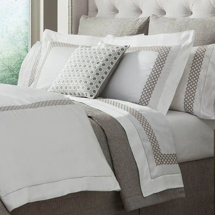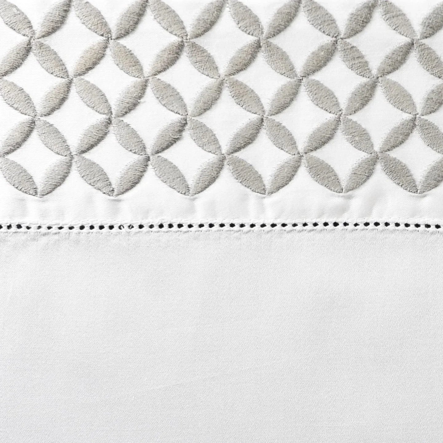 Les taies d'oreiller Avalon sont conçues avec un corps en satin blanc uni, une broderie géométrique le long du poignet et une finition à ourlet guidé à la main.