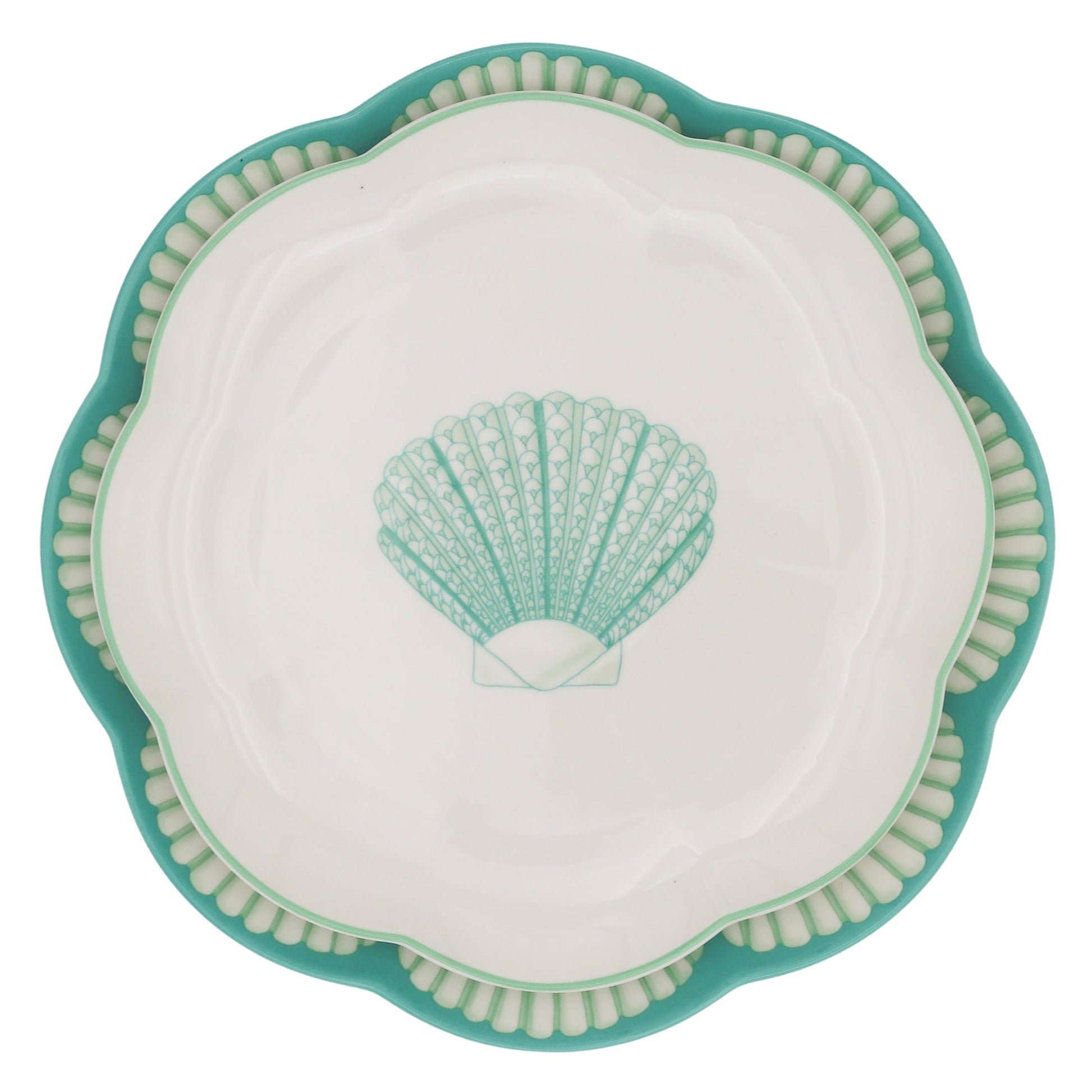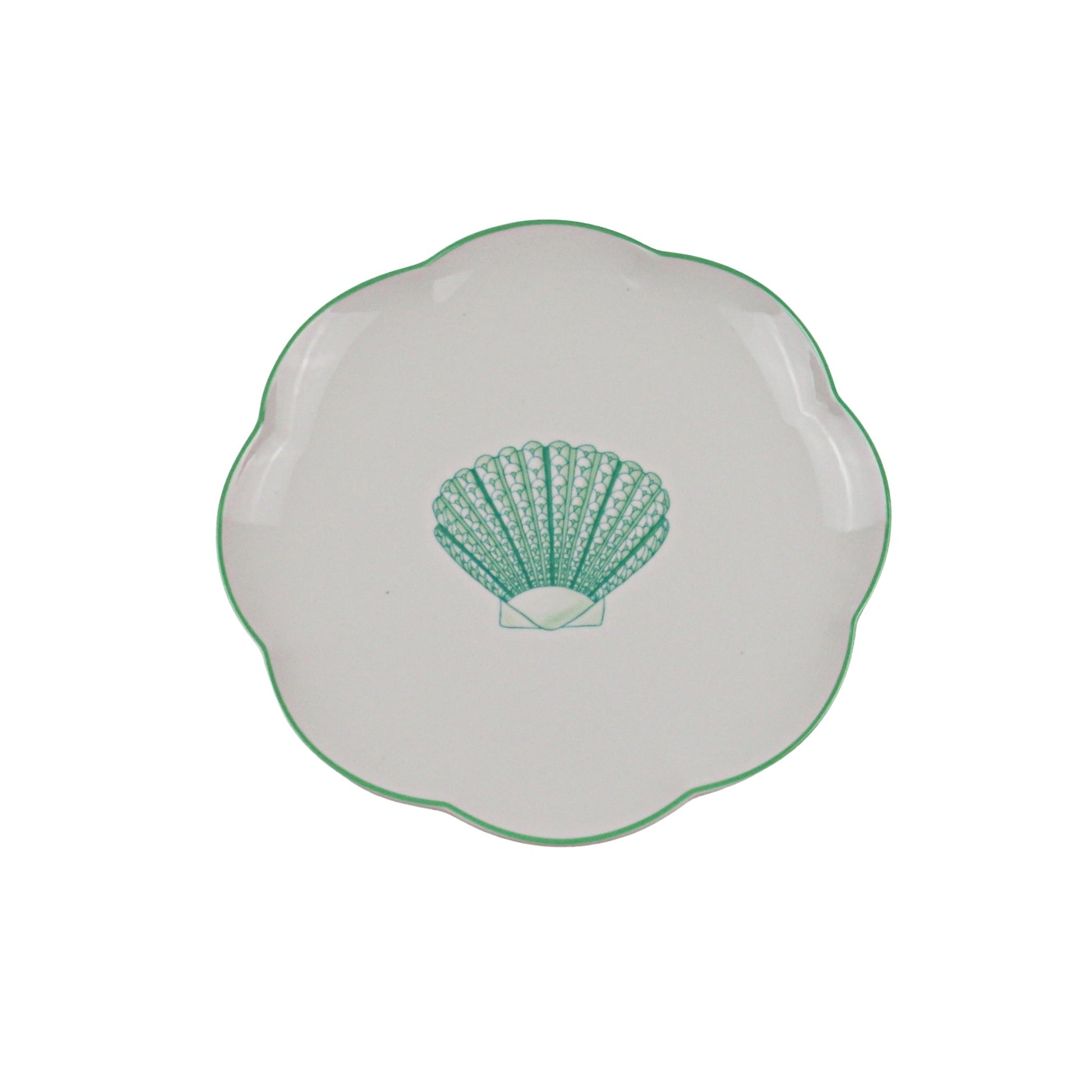 Assiette à entrée en céramique Balearic Blu blanche avec motif coquille Saint-Jacques verte et bord peint à la main (lot de 4)