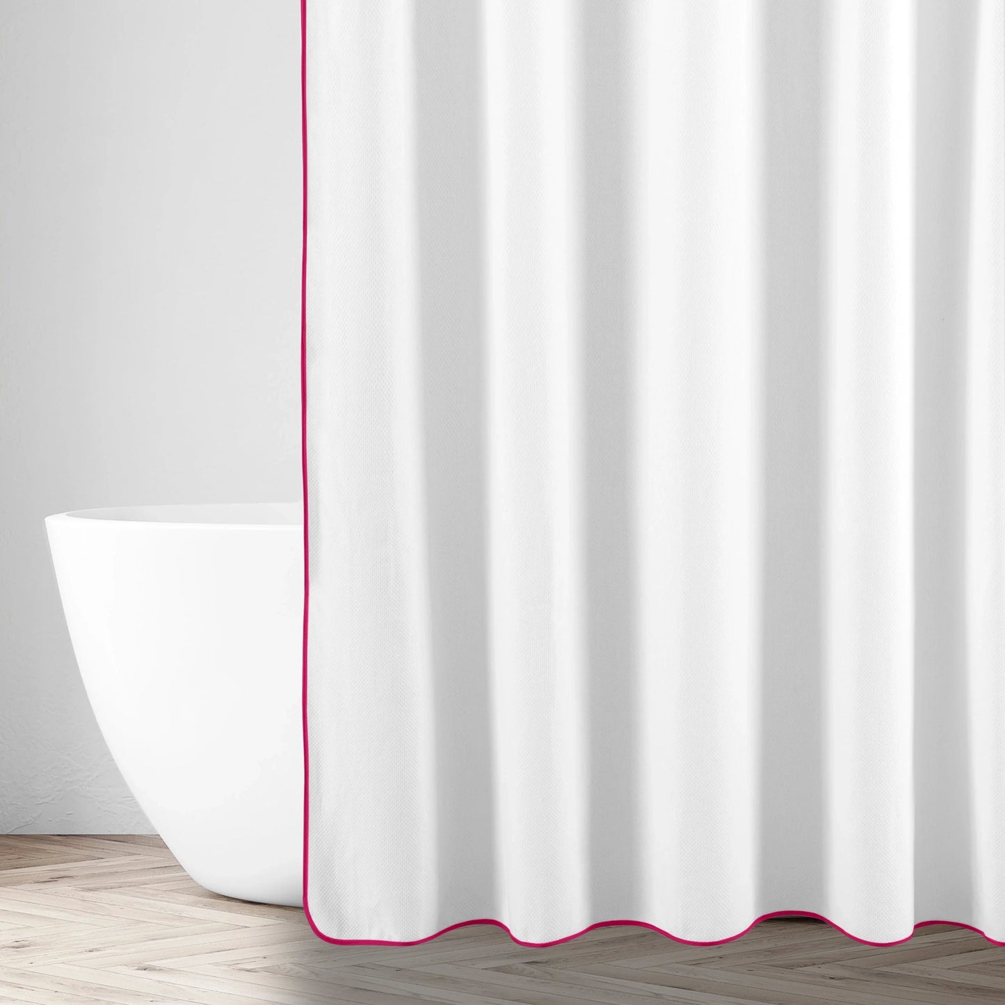 Nos rideaux de douche Bodrum sont dotés de notre piqué nid d'abeille blanc, avec un passepoil relié pour une finition intemporelle.