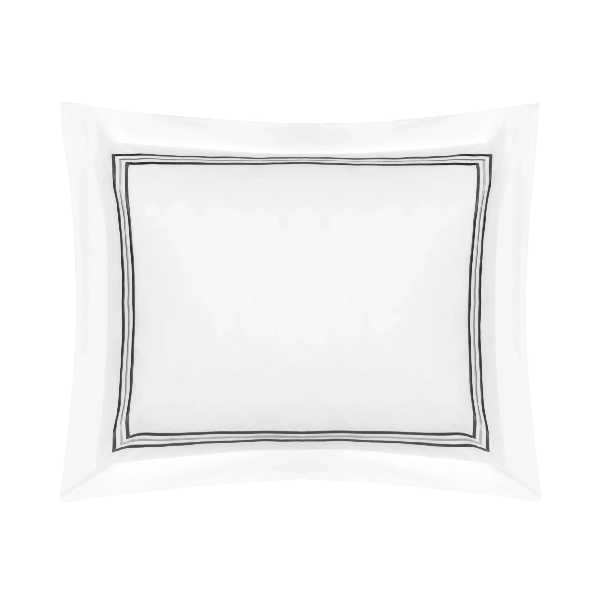 Les taies d'oreiller Delancey sont conçues avec un corps en percale blanche unie et un triple point de satin brodé en deux couleurs tonales.