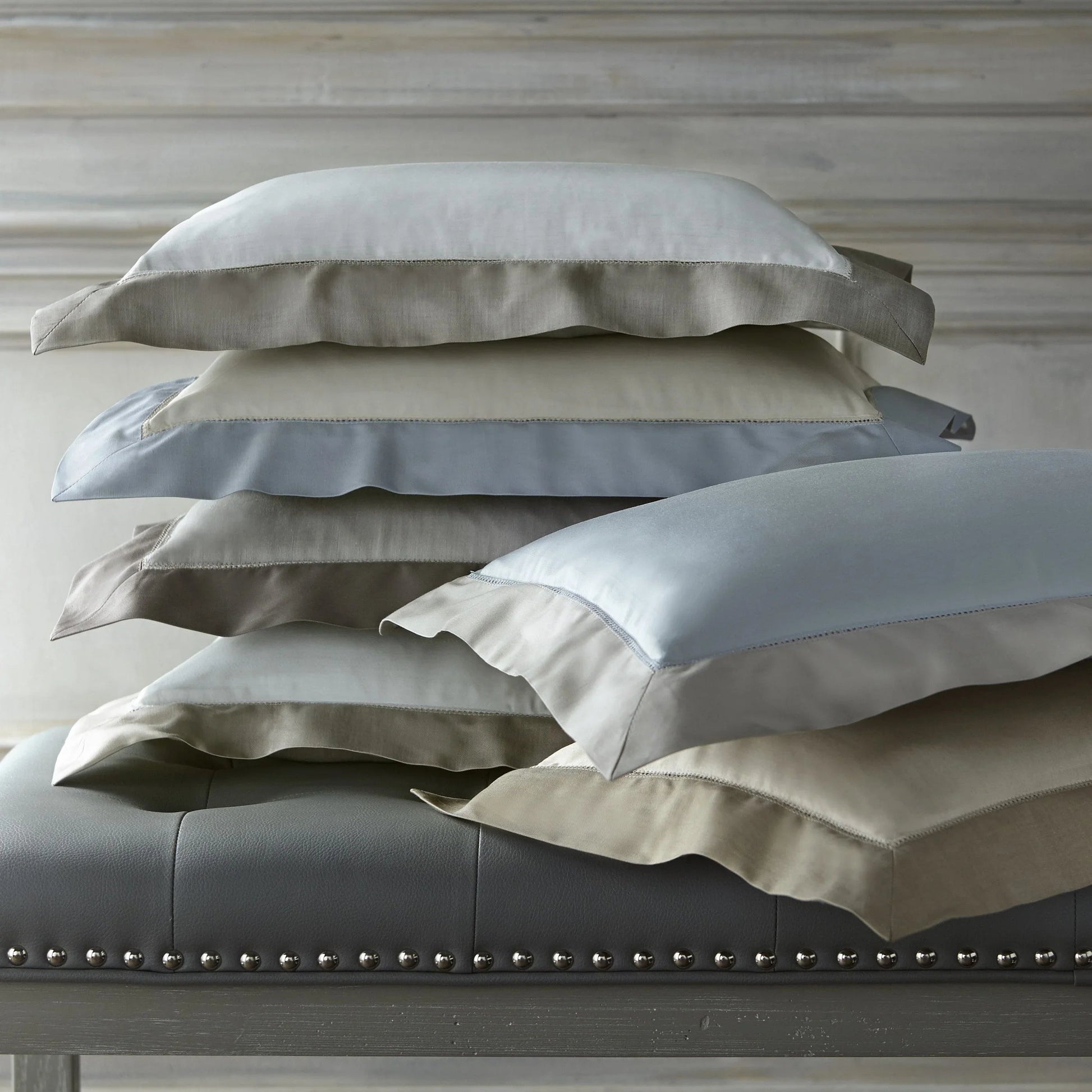 Les housses de couette Doppio sont conçues avec un revers et un envers inversés, avec une finition à ourlet ton sur ton, guidée à la main, le long de l'ourlet. (Remarque : les housses de couette sont dotées de quatre attaches d'angle et d'une fermeture à boutons.)