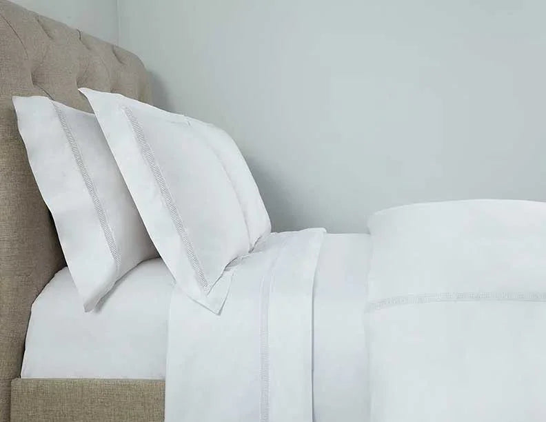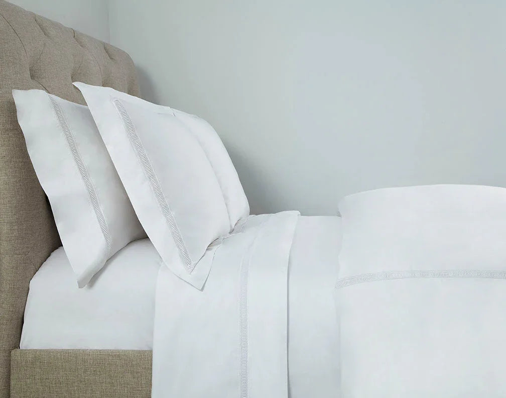 Les jupes de lit Doric sont sur mesure, avec trois panneaux et une chute de 16 pieds, en percale unie avec un insert en dentelle moderne.