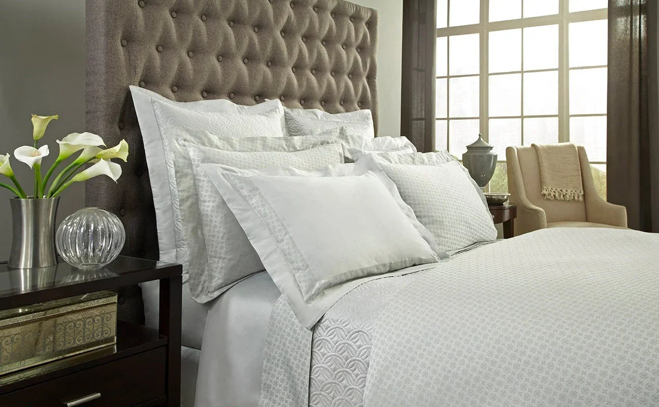 Les taies d'oreiller Duomo sont conçues avec un corps en satin uni et un revers à motif pendentif de 3'.