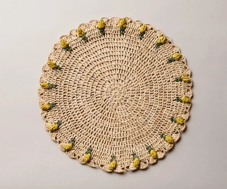 Set de table tulipe fait main – Set de table floral en raphia au crochet – Décoration de table printanière et de Pâques – Vaisselle artisanale – Décoration de salle à manger bohème