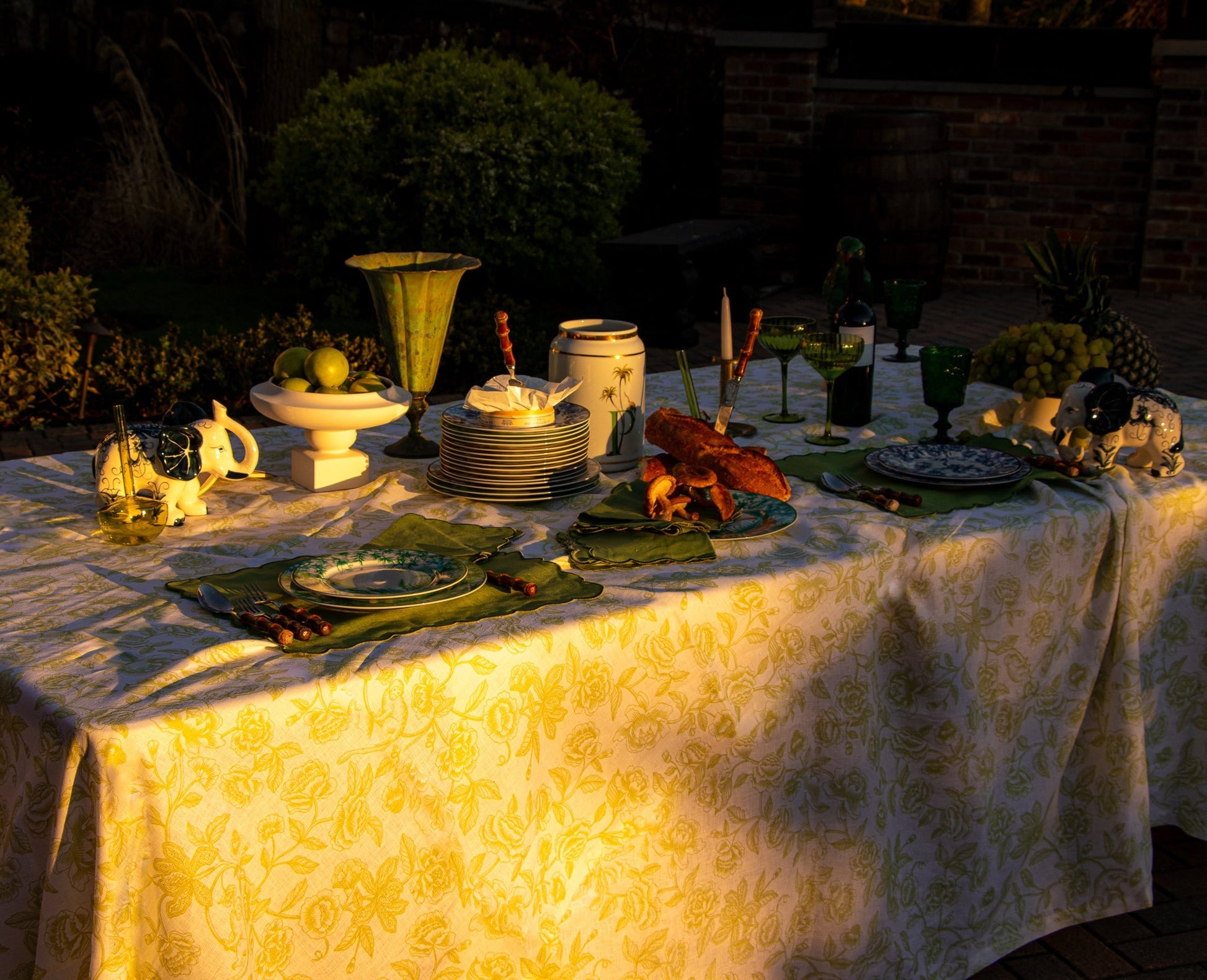 Plongez dans un havre de paix botanique avec la nappe Ivory Flora Parlour en lin haut de gamme. Son fond blanc met en valeur les luxuriantes fleurs vert pistache, évoquant un jardin paradisiaque et serein. Observez les pétales et vous découvrirez des singes fantaisistes s'ébattant. Pour parfaire le décor et sublimer votre repas, associez-la aux sets de table et serviettes Shimla Social assortis, ainsi qu'aux autres articles de la collection, et laissez-vous transporter dans un jardin enchanteur.