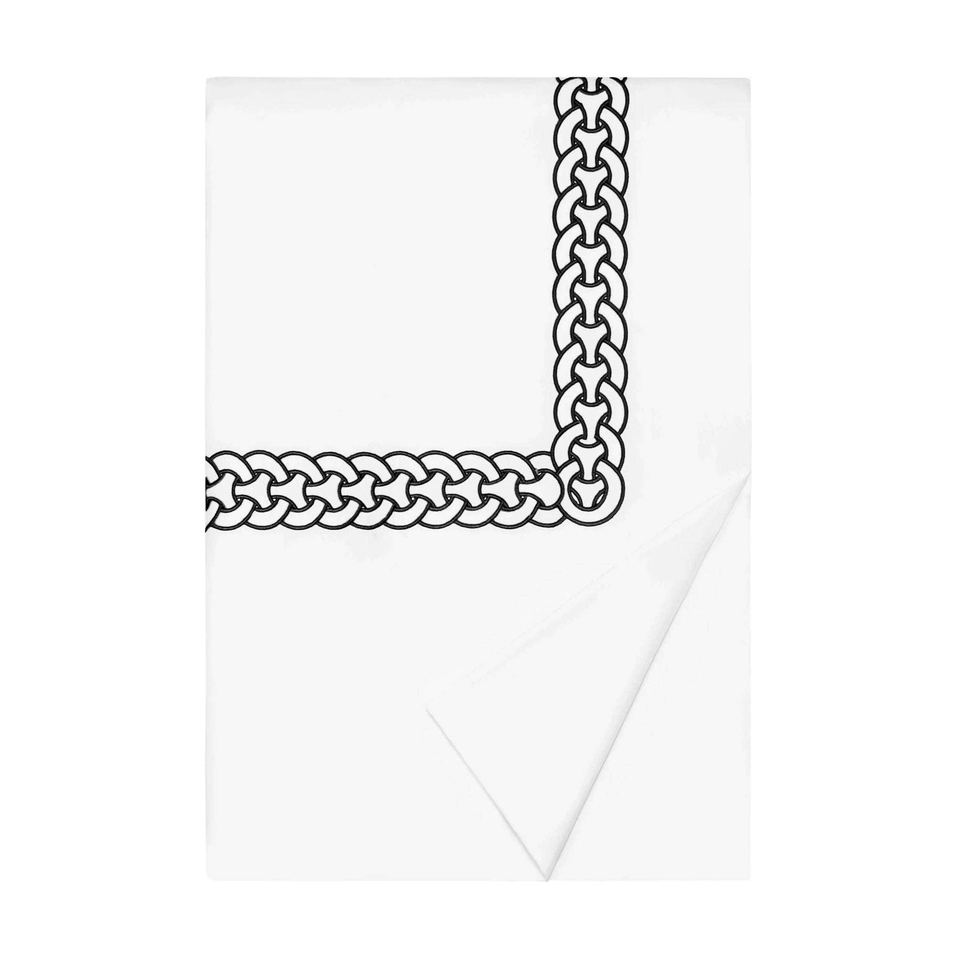 Les housses de couette Links sont conçues avec un corps en percale blanche unie, une broderie en forme de U inspirée d'une chaîne encadrant le matelas et un ourlet à bride. (Remarque : les housses de couette sont dotées de liens aux coins et d'une fermeture à boutons.)