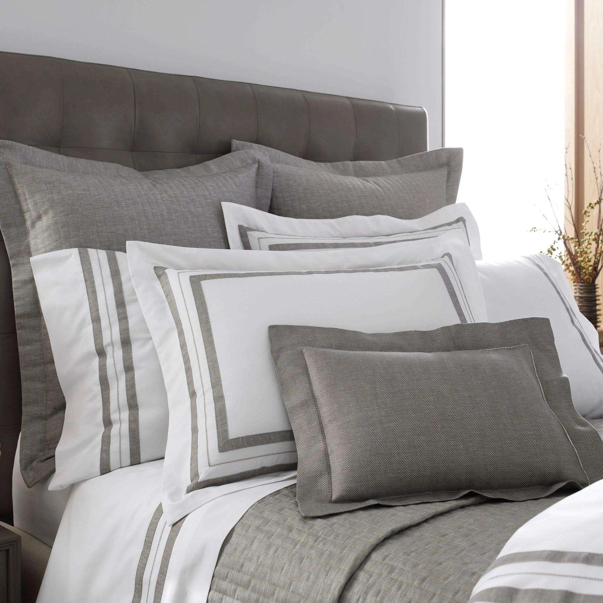 Les draps plats Malibu sont conçus avec deux rubans de lin appliqués coupés à la main et un point d'ourlet ton sur ton entre les deux, le long de l'ourlet du poignet.