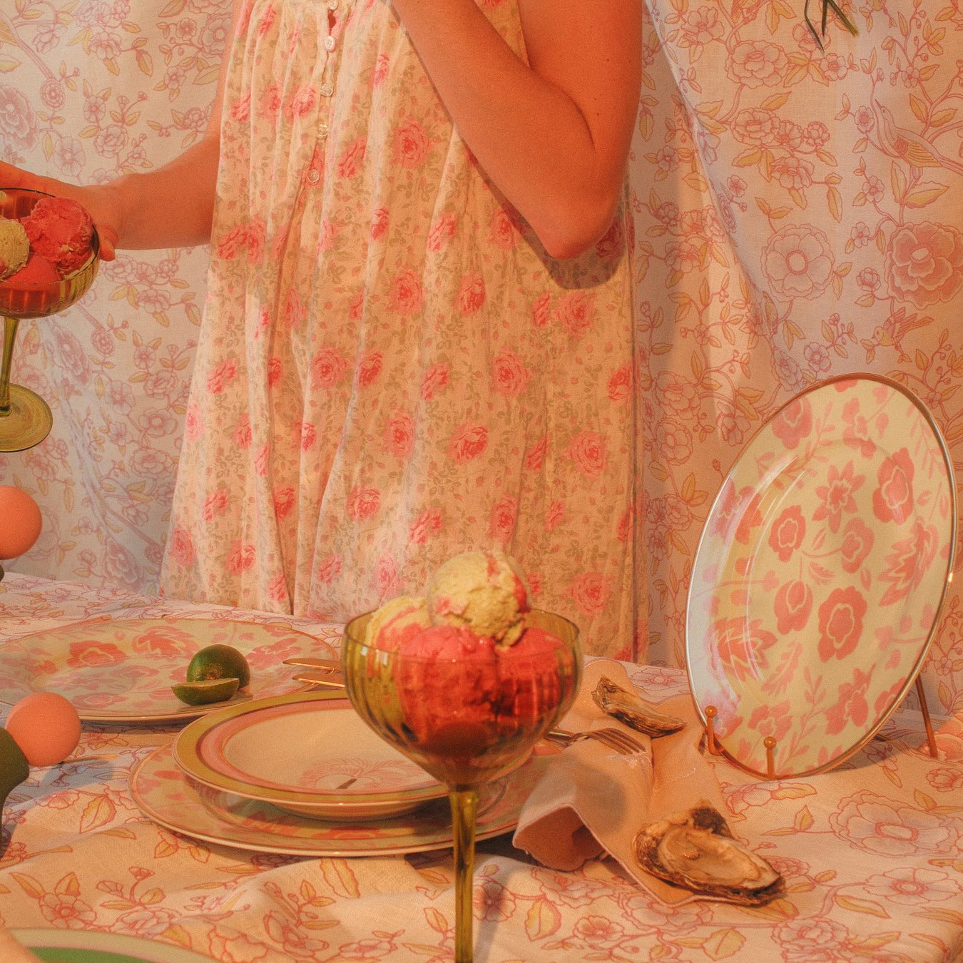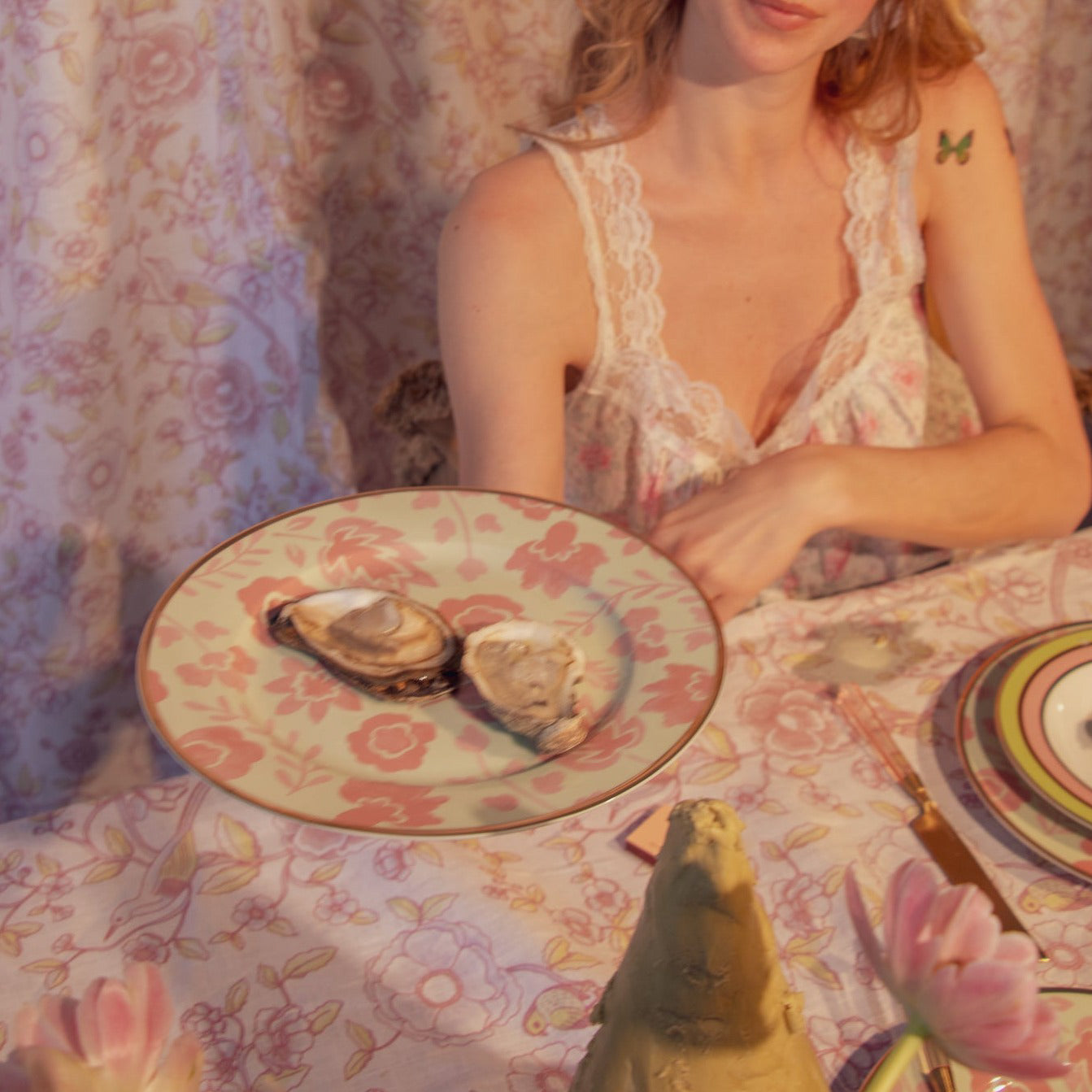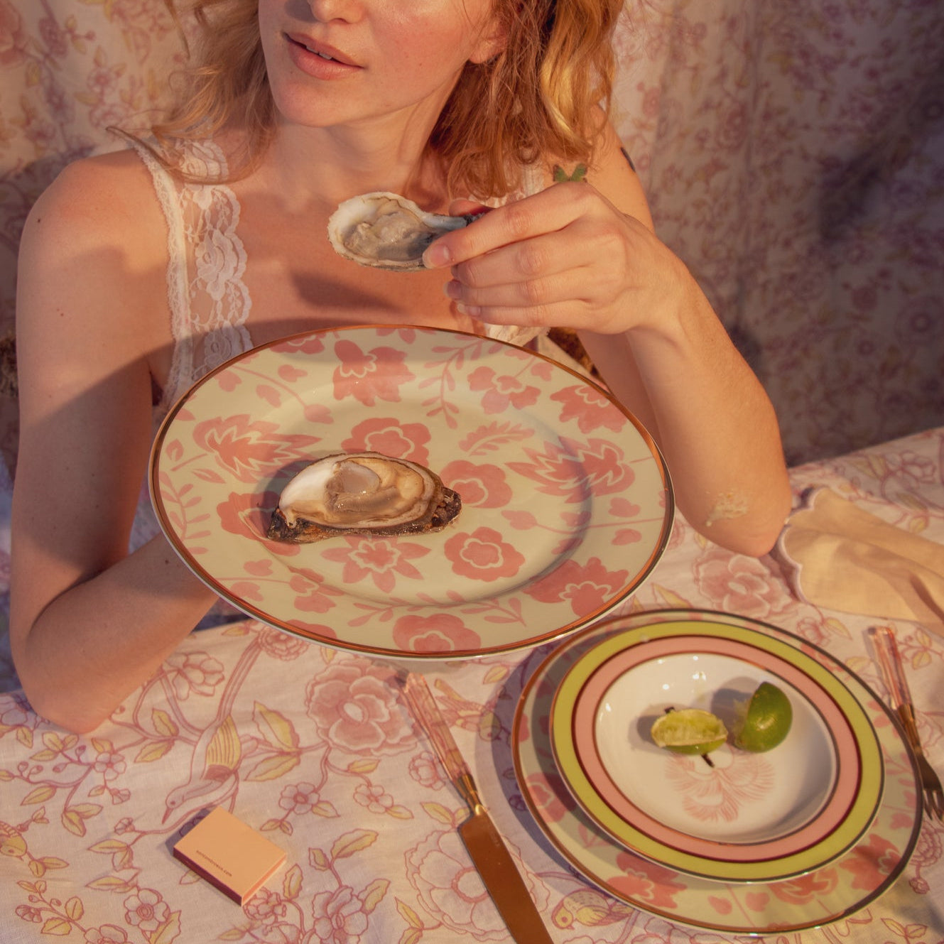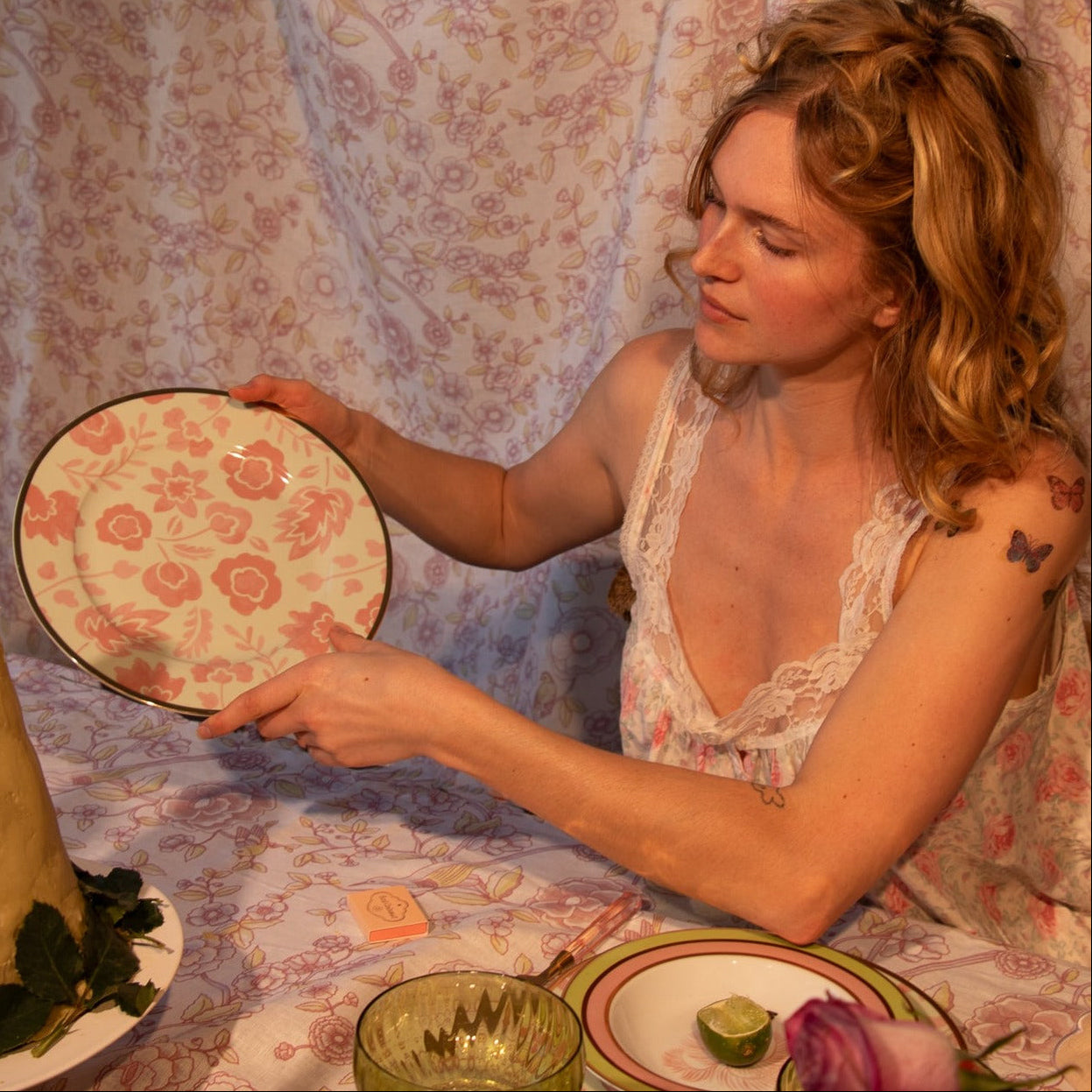Plongez dans un univers nostalgique entre côte et désert avec notre assiette plate Pistache et Litchi. Des fleurs et des feuilles dessinées à la main dans des tons rosés apaisants contrastent avec une teinte sorbet pistache pastel qui évoque l'attrait intemporel des couchers de soleil sur la plage et des paysages désertiques à perte de vue. Conçue pour l'âme contemporaine, toujours jeune d'esprit. Cerclée d'un liseré doré.