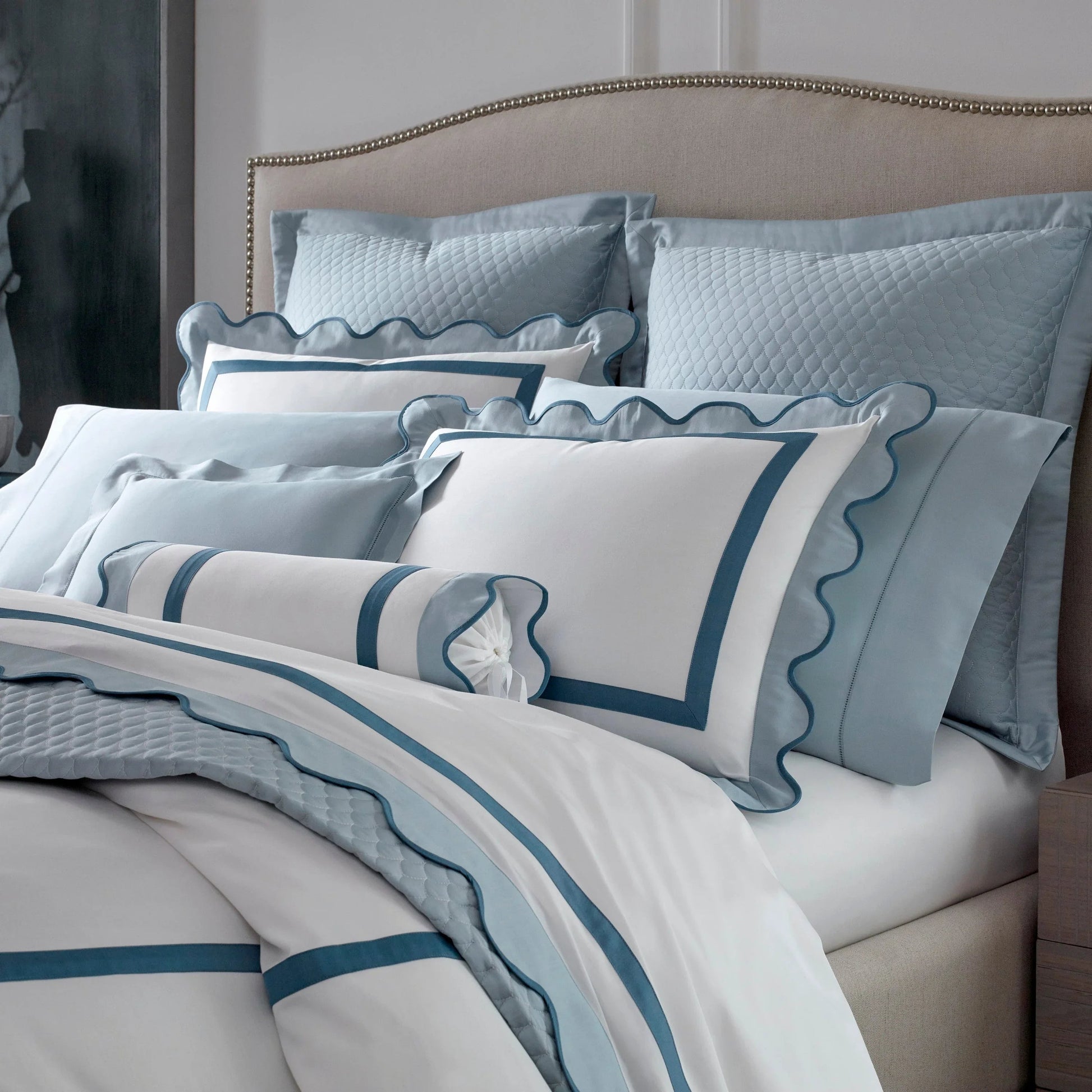 Les taies d'oreiller Portofino sont conçues avec une base en satin blanc naturel solide, avec un insert en satin contrastant de 1,5' et un feston assorti, avec une couleur secondaire sur le revers.