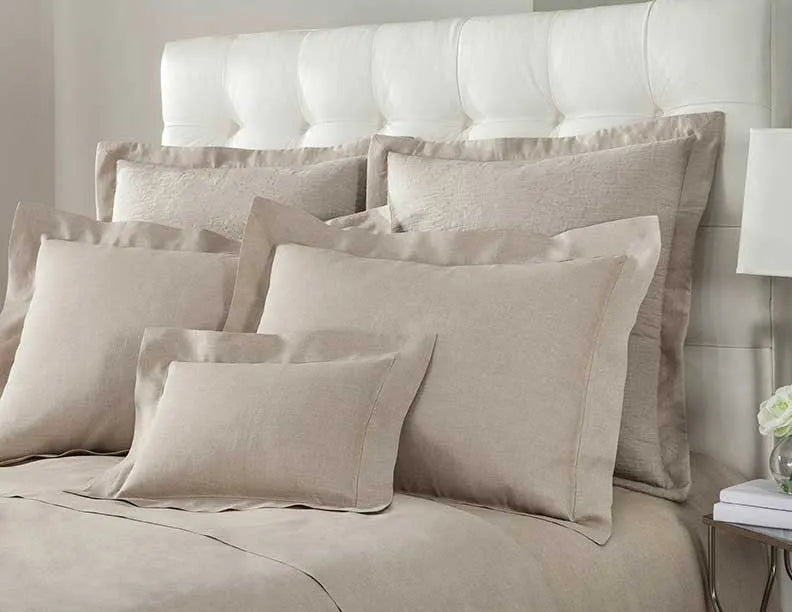 Les taies d'oreiller Provenza sont finies avec un point d'ourlet ton sur ton guidé à la main le long de l'ourlet de la bride.
