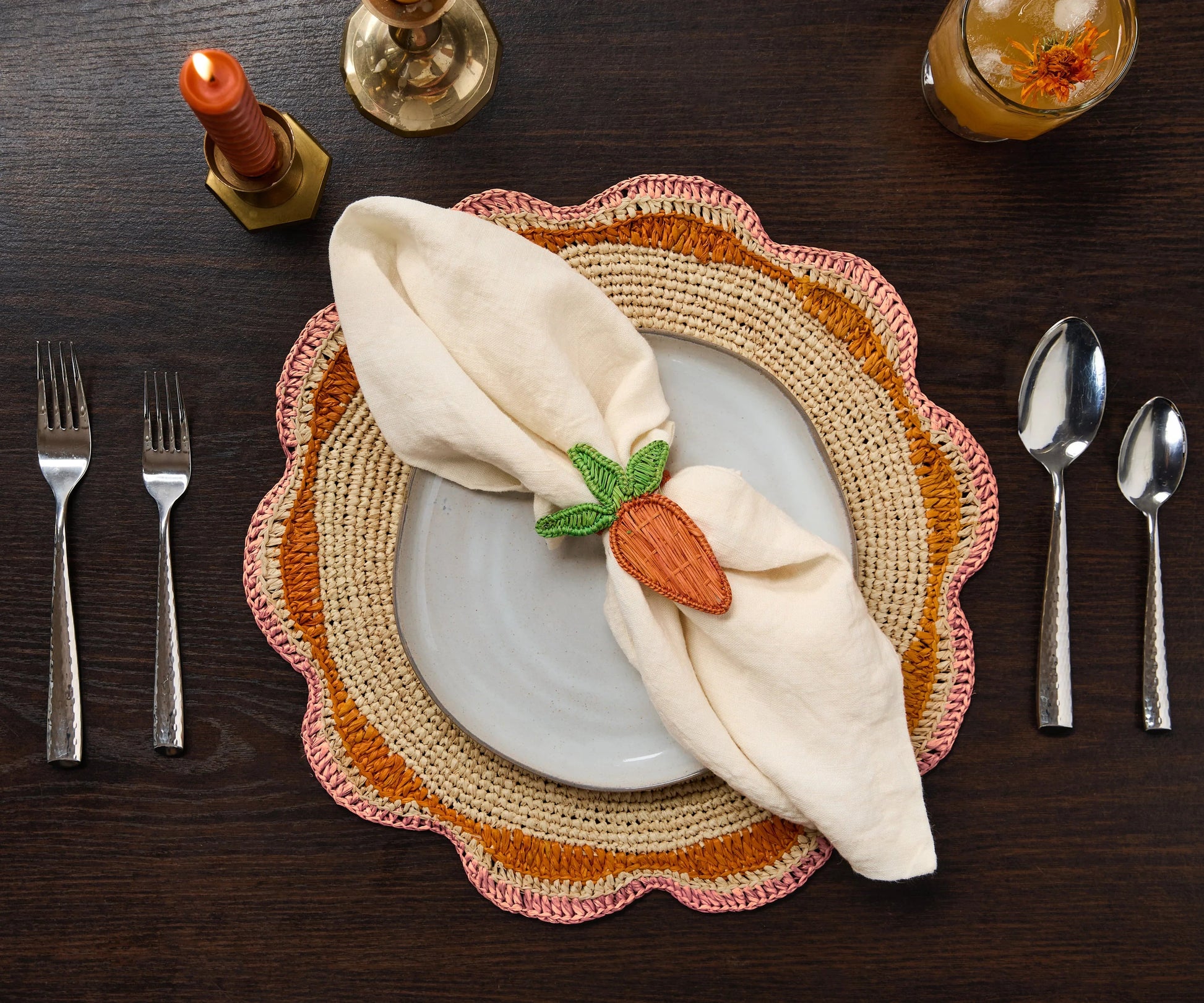 Que vous prépariez le décor pour une garden-party, un brunch en plein air ou que vous cherchiez simplement à rehausser vos repas quotidiens, ce set de table artisanal ajoute une touche ludique et bohème-chic à votre décor de table.