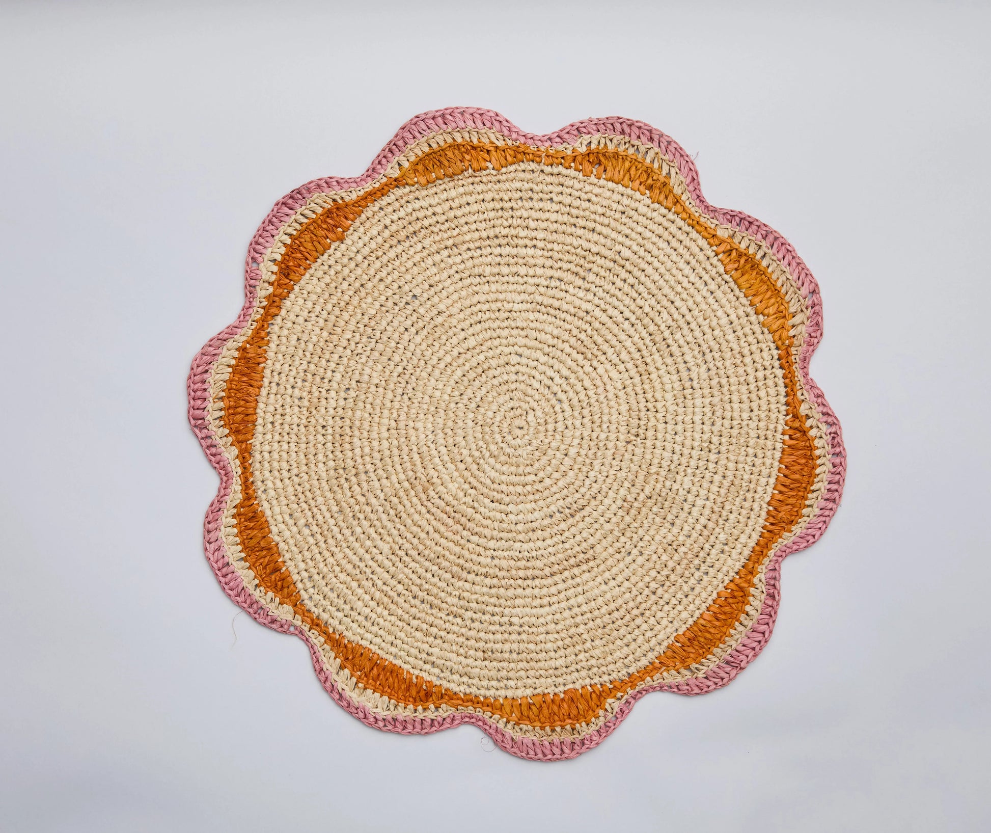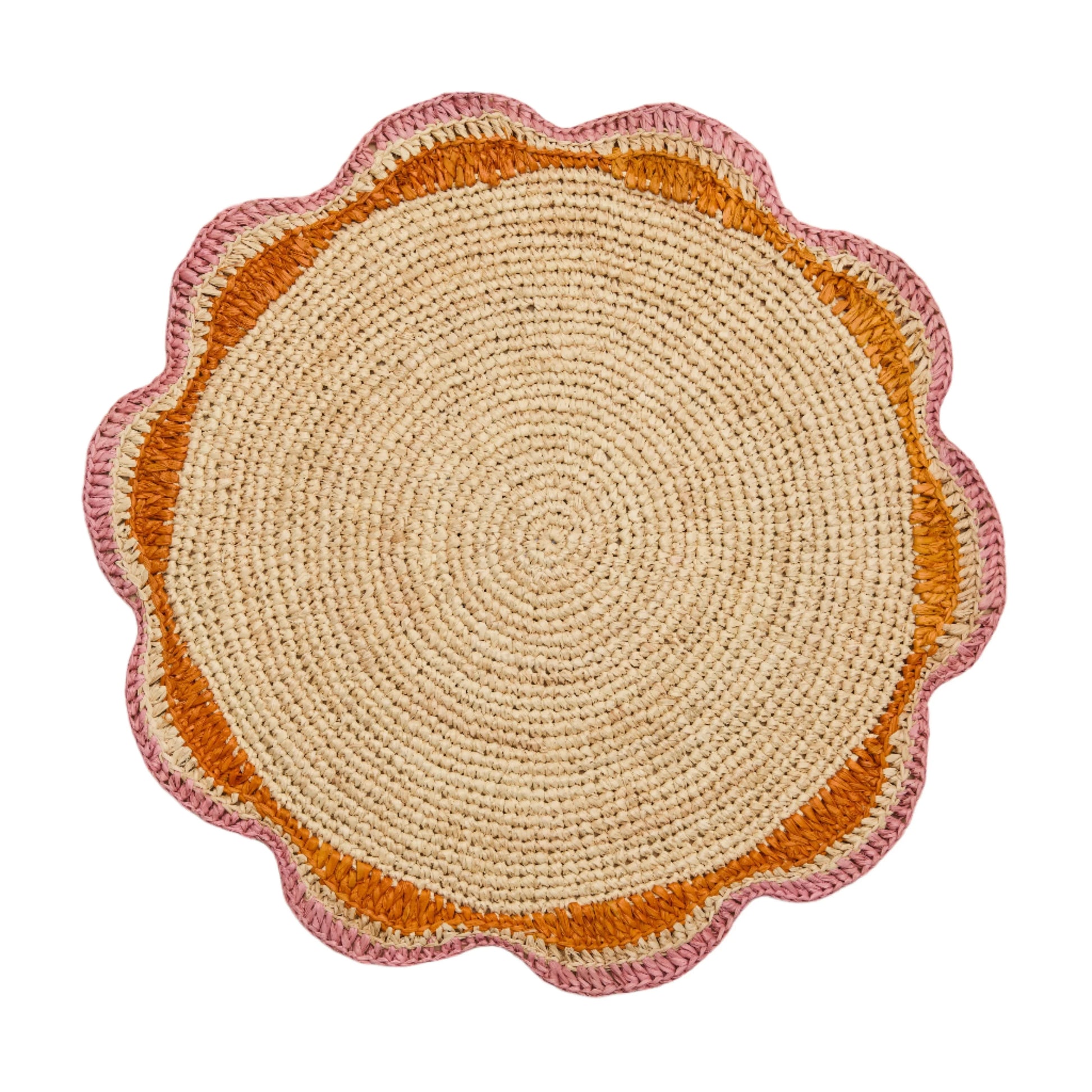Ajoutez une touche de couleur joyeuse à votre table avec ce set de table rond en raphia rose. Orné d'un motif de moulinet crocheté à la main, ce set rose vif apporte chaleur, texture et personnalité à votre table. Fabriqué par des artisanes qualifiées à Madagascar, chaque set de table est fabriqué à partir de raphia issu de sources durables, un matériau écologique et plein de charme.