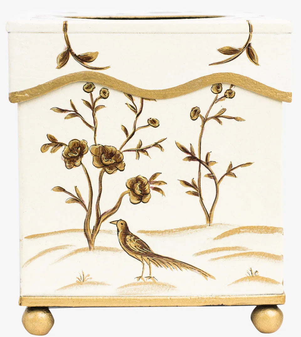 Superbe porte-mouchoirs festonné avec détails en feuille d'or. Cet article peut contenir une boîte de mouchoirs de taille standard.