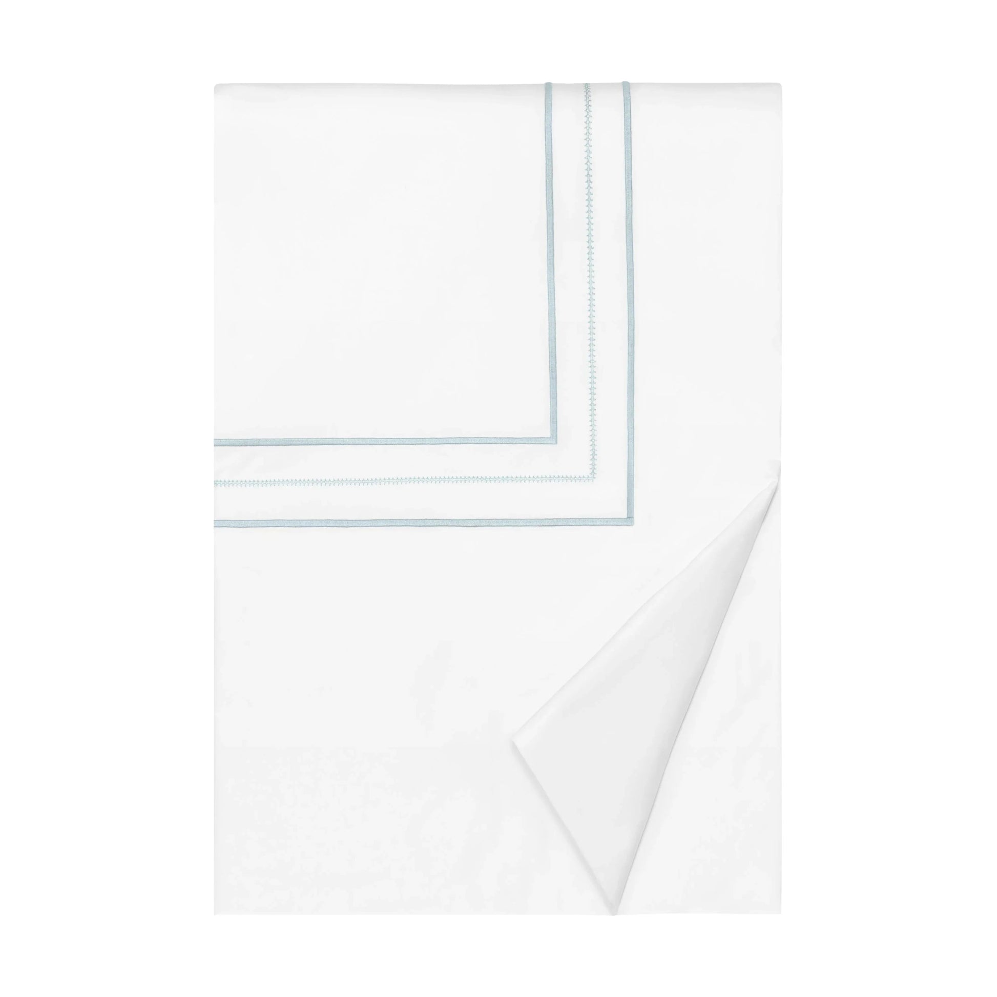 Les housses de couette Triad sont conçues avec un corps en percale unie et un trio monochrome de points de satin, d'ourlet et de point de satin en forme de U encadrant le matelas. (Remarque : les housses de couette sont dotées d'une bordure en couteau, de quatre attaches d'angle et d'une fermeture à boutons.)