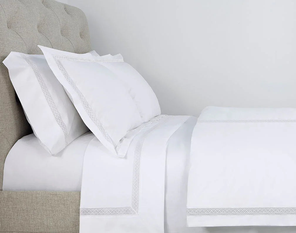 Les taies d'oreiller Valencia sont conçues avec une percale italienne solide et une élégante dentelle appliquée sur la bride.